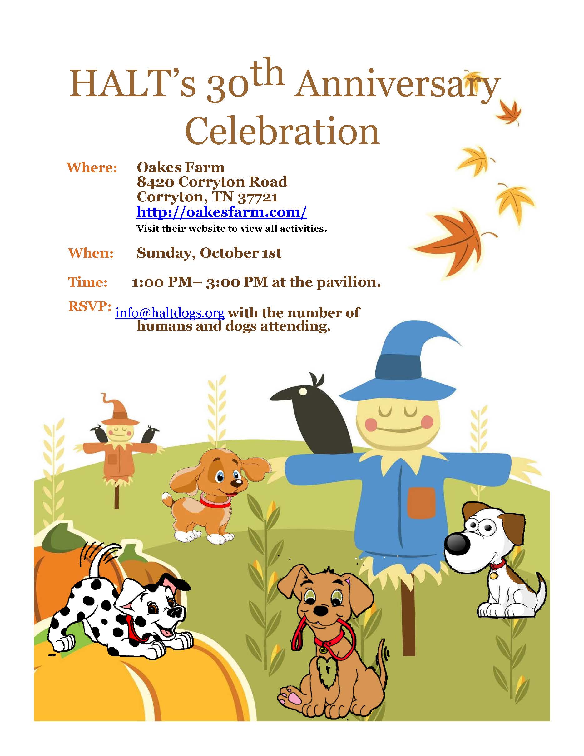 HALT is celebrating 30 years! We want to celebrate all of our volunteers, HALT Graduates and their families, and those that have supported the program over the years. We look forward to the “where are they now” with the graduates and their families. Oakes Farm has hay rides, a corn maze, pumpkin patch, and lots of other family friendly activities to enjoy the day. Dogs are welcome on leash (please, no retractable leashes). Cupcakes for the humans and special treats for the dogs will be provided. Oakes does have concession stands on site with food for purchase.
