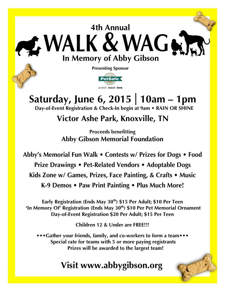 Please join us on Saturday, June 6, 2015 for the 4th Annual Walk & Wag held in memory of ten-year-old Abby Gibson. This dog friendly, family event will be held at Victor Ashe Park from 10am to 1pm with day-of-event registration and early registration check-in starting at 9am. This event is RAIN OR SHINE. Come and join us for Abby’s memorial walk and a day full of fun for you, your dog(s), and the whole family!