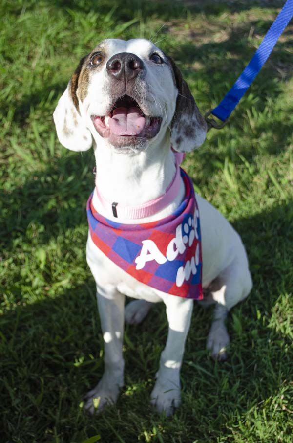 Fun loving, white and brindle-brown hound mix. About 1 year old and 26lbs. Long and lanky hound legs to go with a sleek fur coat. She is a sweet soul.