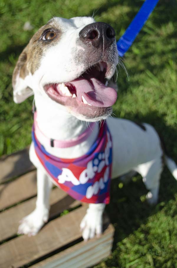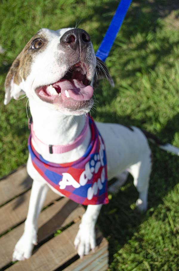 Fun loving, white and brindle-brown hound mix. About 1 year old and 26lbs. Long and lanky hound legs to go with a sleek fur coat. She is a sweet soul.